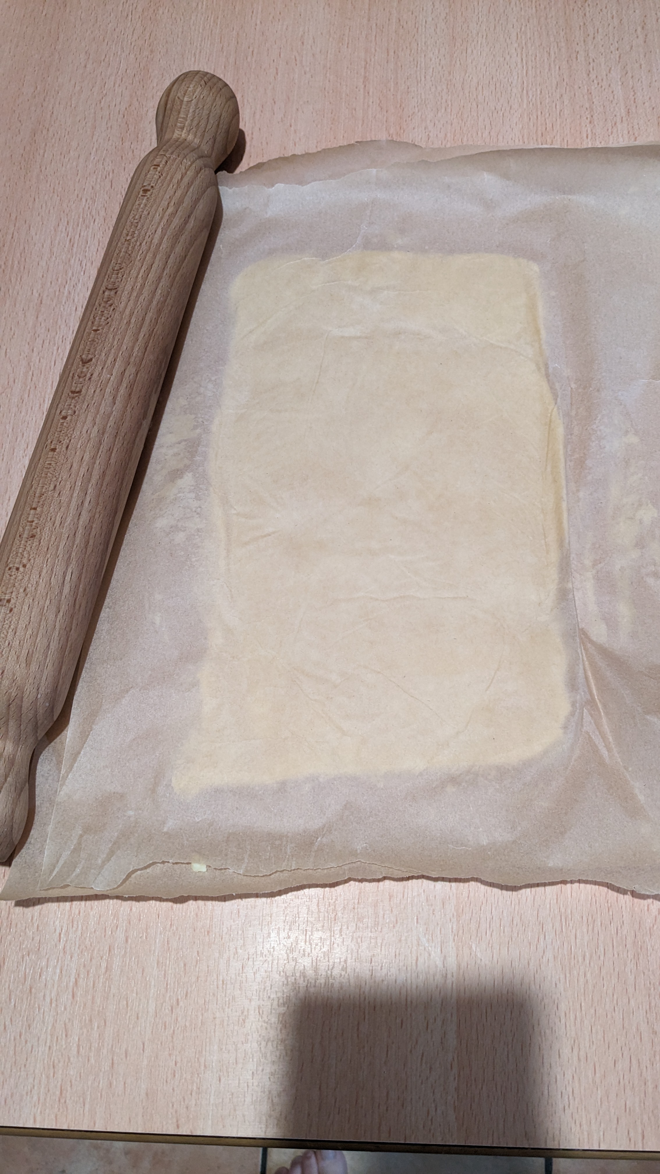 Ensuite entre 2 feuilles de papier cuisson , aplatissez au rouleau le beurre manié pour obtenir un rectangle