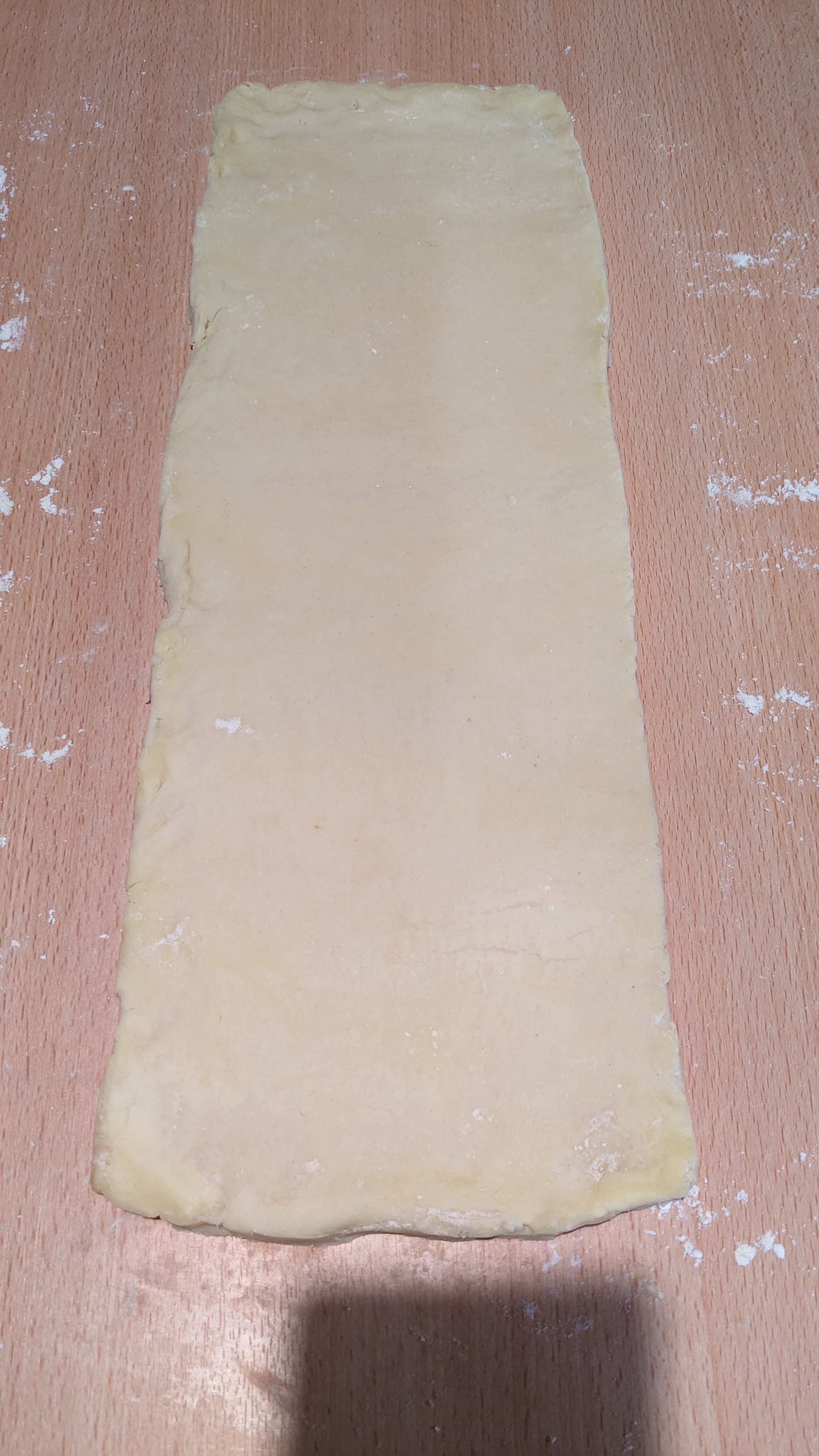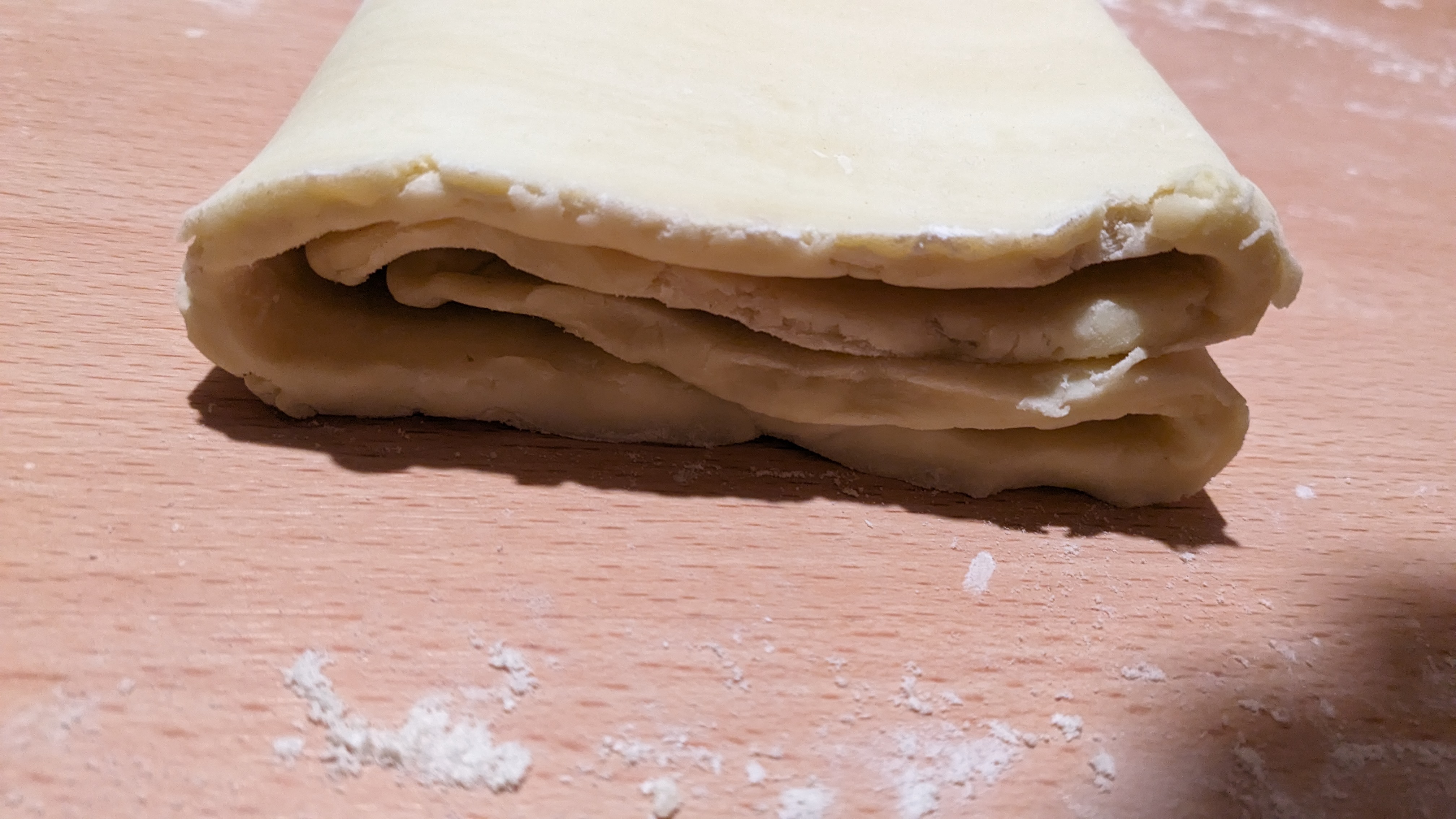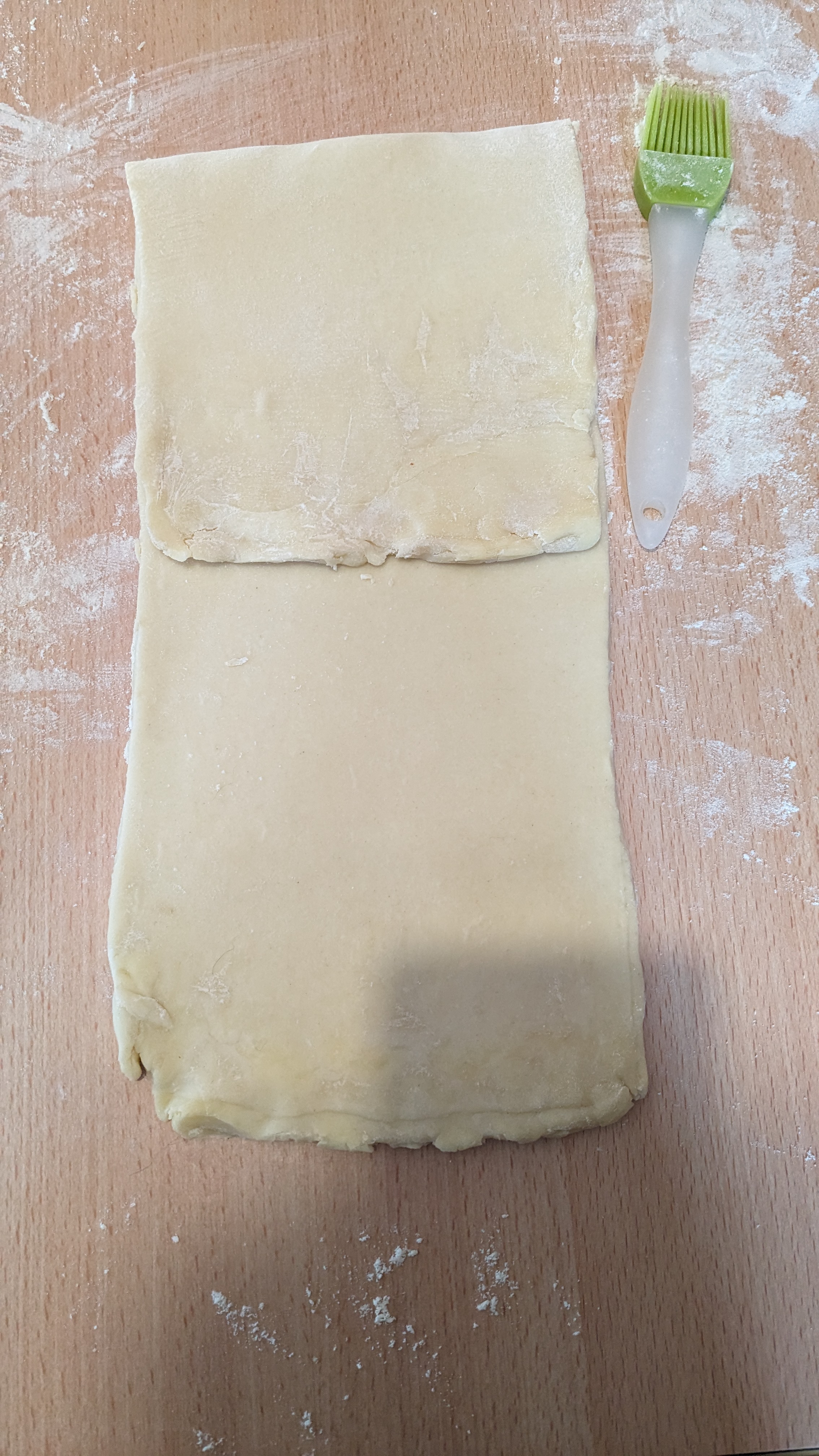 Remettez au frais plusieurs heures puis réétalez mais pliez en tiers : le tiers supérieur vers l’intérieur et recouvrez du tiers inférieur de la pâte ( celui vers vous )