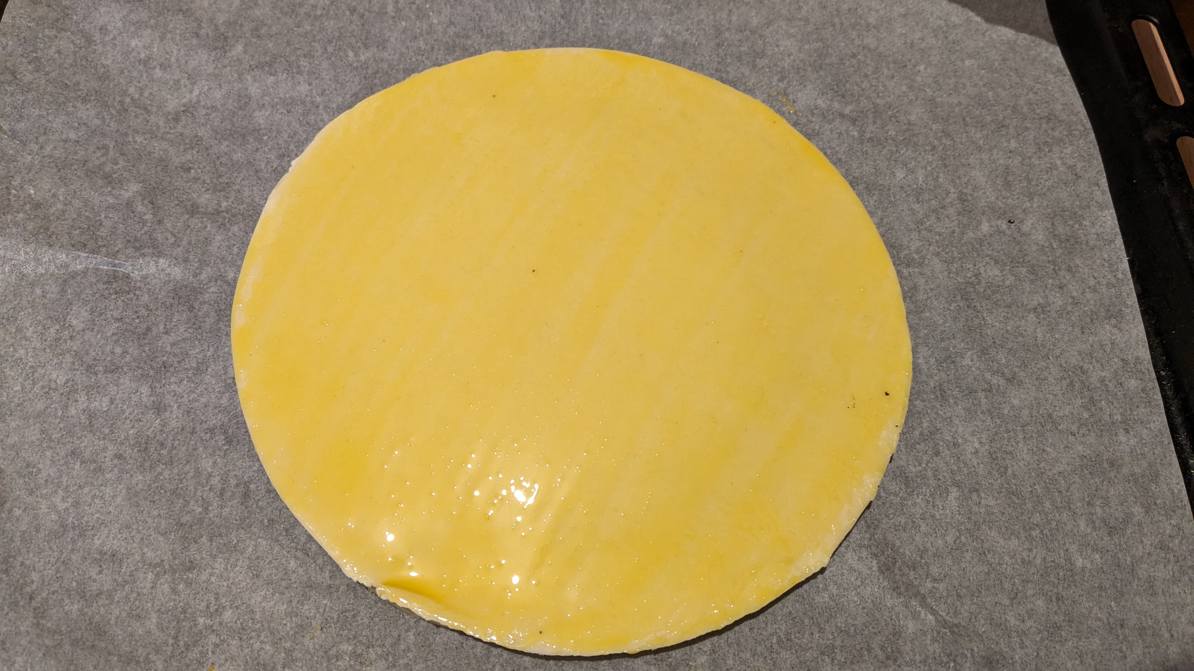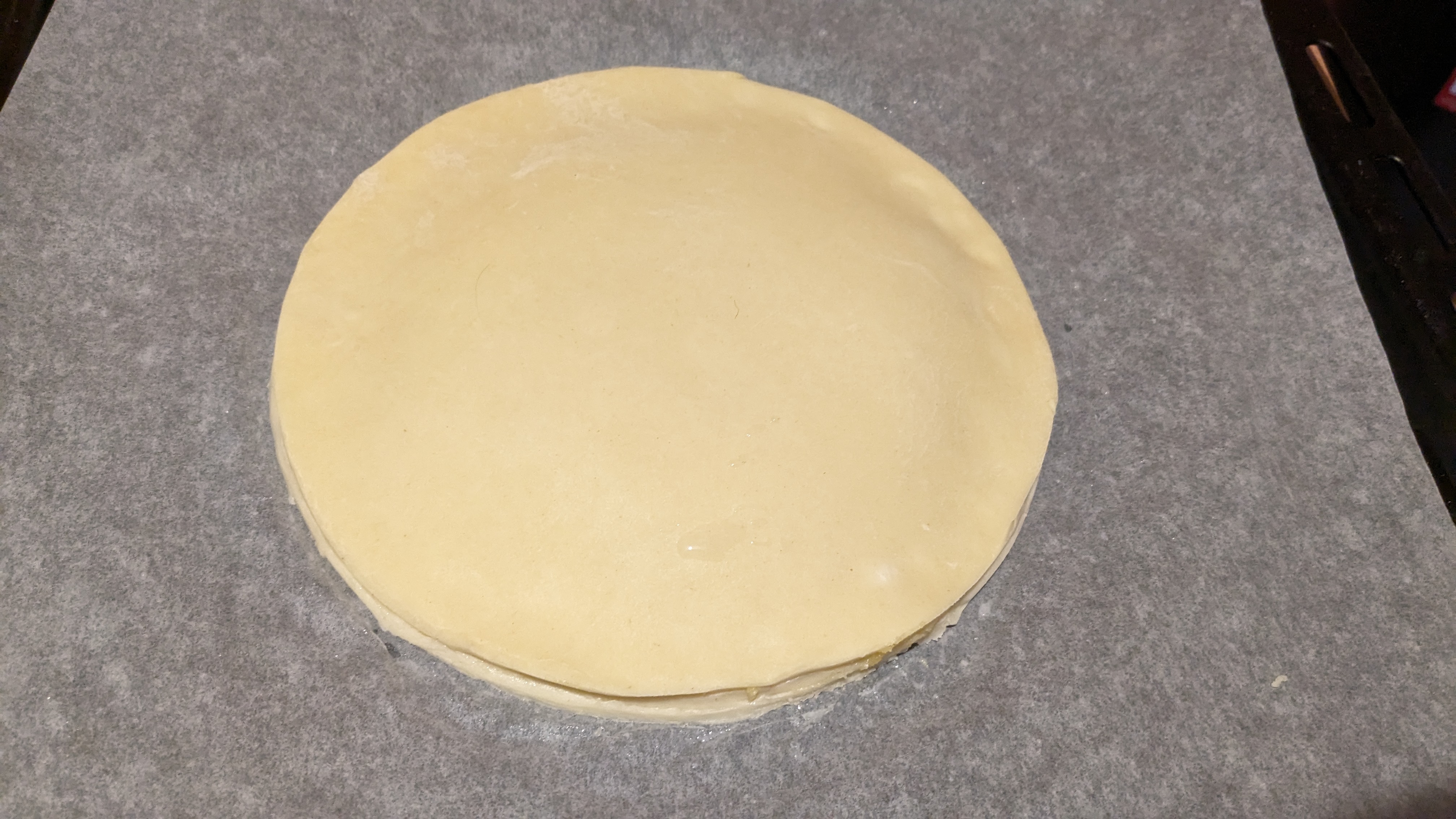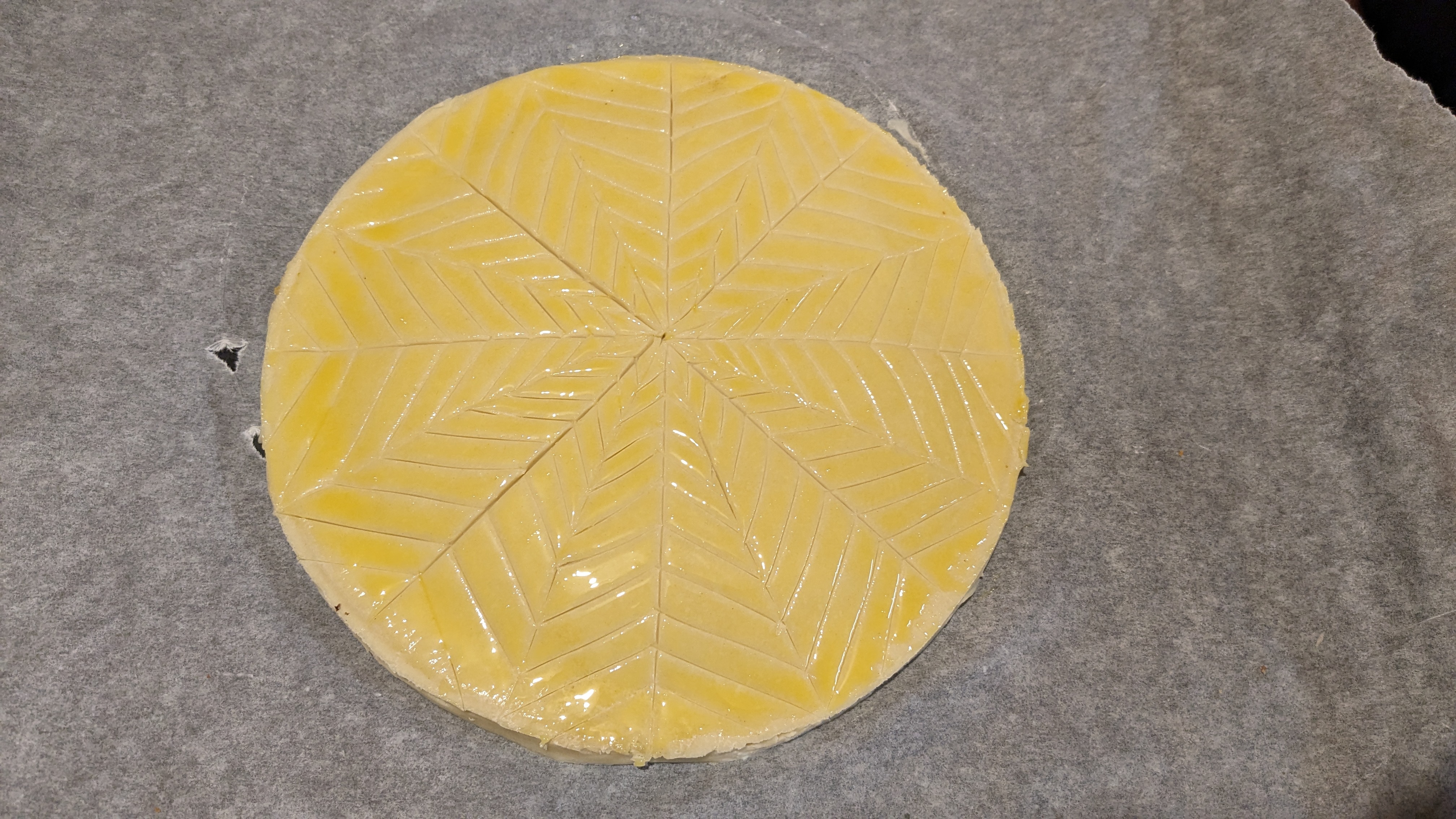 Prenez un jaune d’oeuf et une petite cuillère de crème fraîche , badigeonnez le dessus . Placez au frais 30 min et redorez au pinceau . Avec un couteau bien pointu , tracez votre graphisme et enfournez à chaleur tournante 150 jusqu’à obtenir une belle dorure .