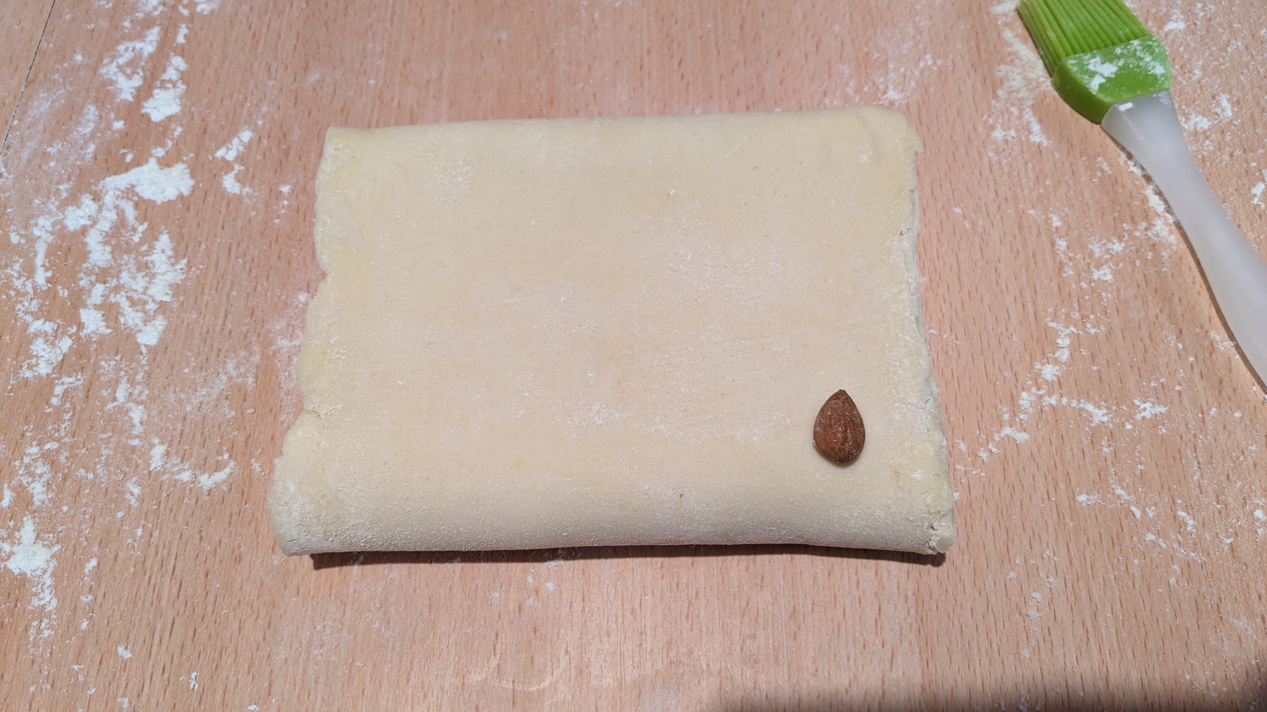 Refaites exactement le même processus d’étaler et repliez : c’est le second tour double . L’amande qui est en bas à droite à la fin du premier tour double doit se retrouver en haut à droite pour faire le second tour double ( quart de tour en sens inverse des aiguilles d’une montre )