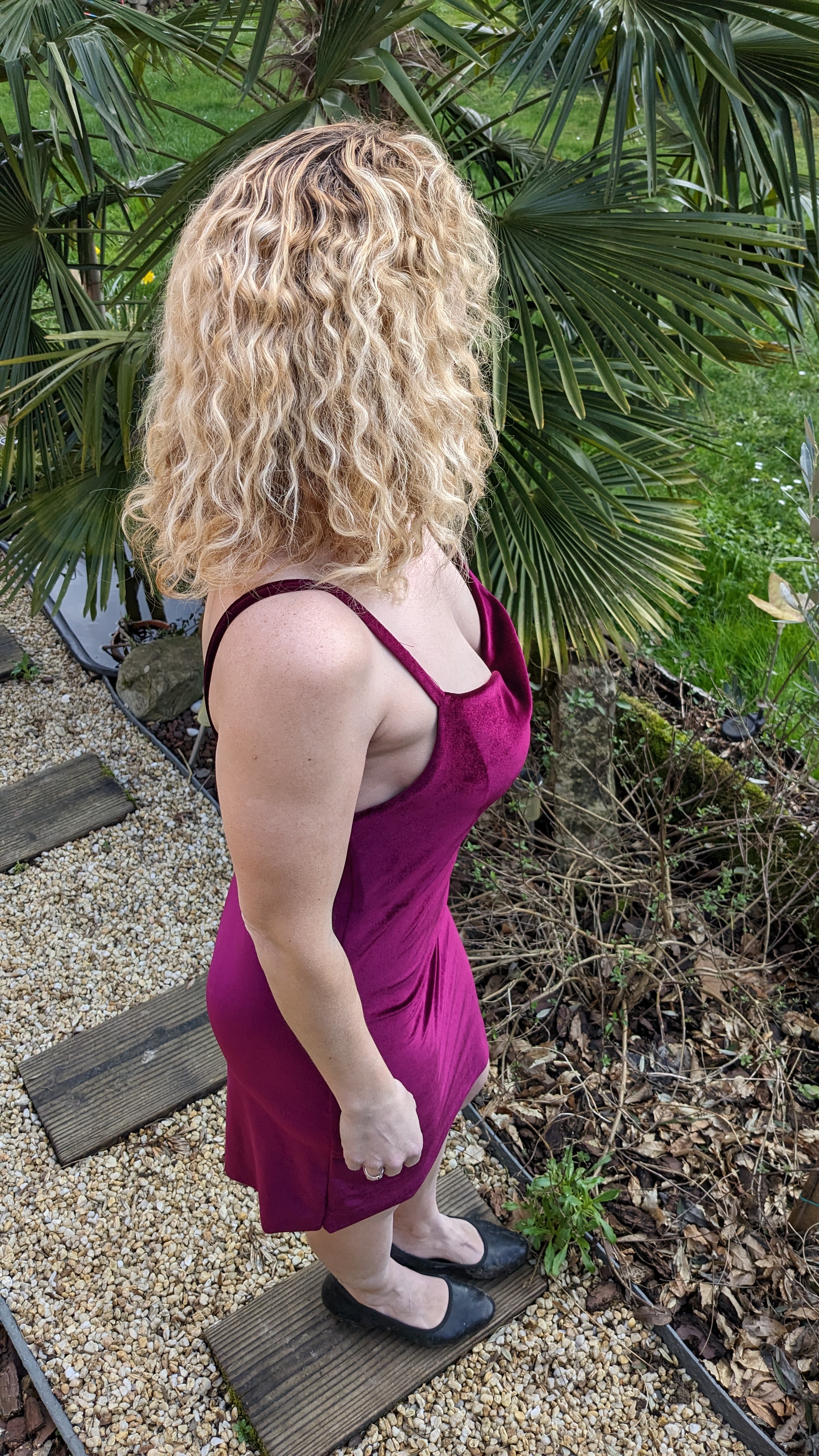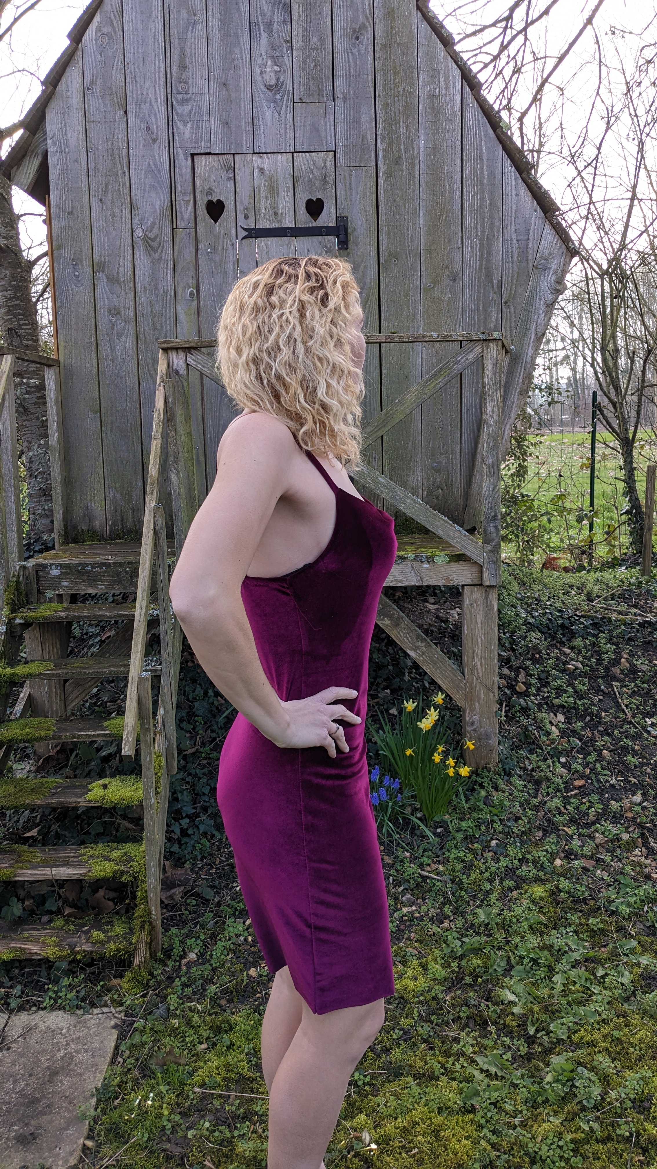 Bonjour , en grande fan des patrons Clématisse Pattern , j’avais succombé dès sa sortie au patron de la robe Scarlette qui est une « slip dress » c’est-à-dire une robe coupée dans le biais si vous utilisez un tissu chaîne et trame ou coupée dans le sens classique si vous utilisez de la maille… Après une première version en viscose il y a 2 ans me semble-t-il , j’avais en tête une version maille et comme il me restait un coupon de velours suffisant de ma robe de Noël ( velours Rascol ) et une heure devant moi pour coudre j’en ai profité pour vérifier si mon idée était bonne .