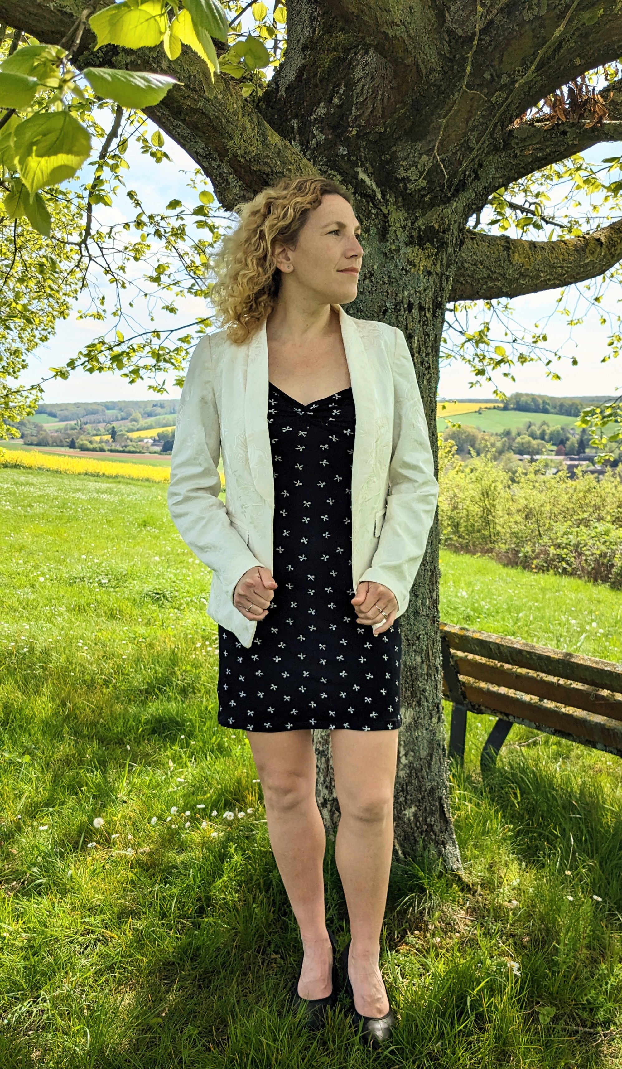 Dessous ma robe est tout simplement une robe en maille que j’ai raccourcie avec un ourlet à l’aiguille double. Je la possède depuis plus de 12 ans 😉