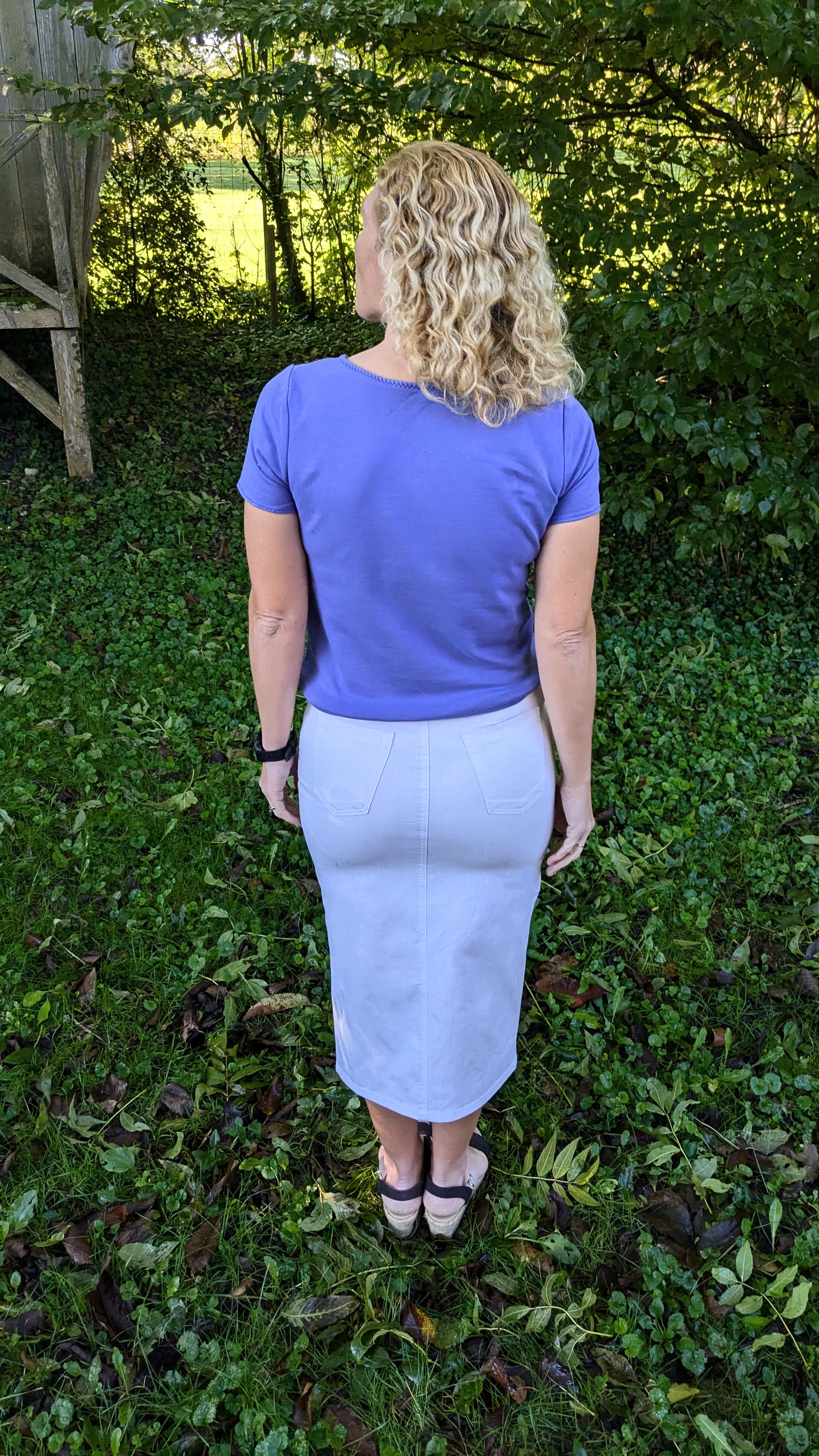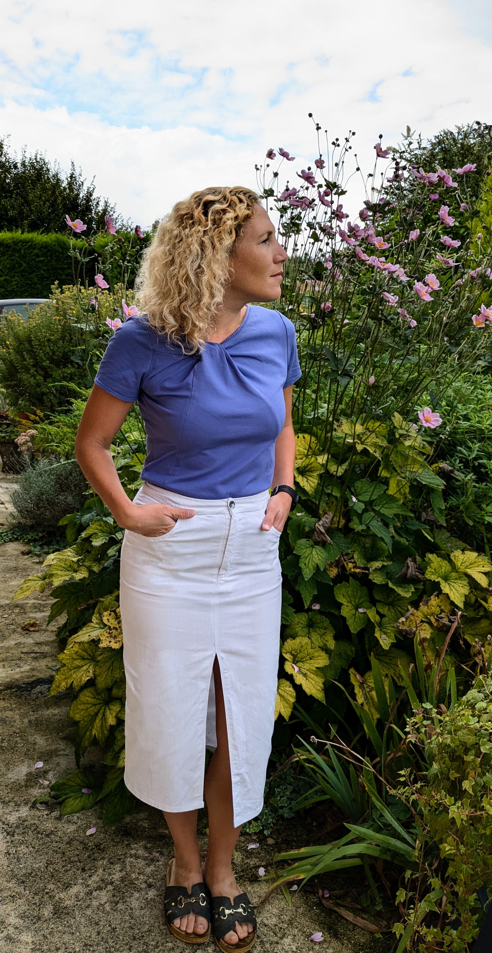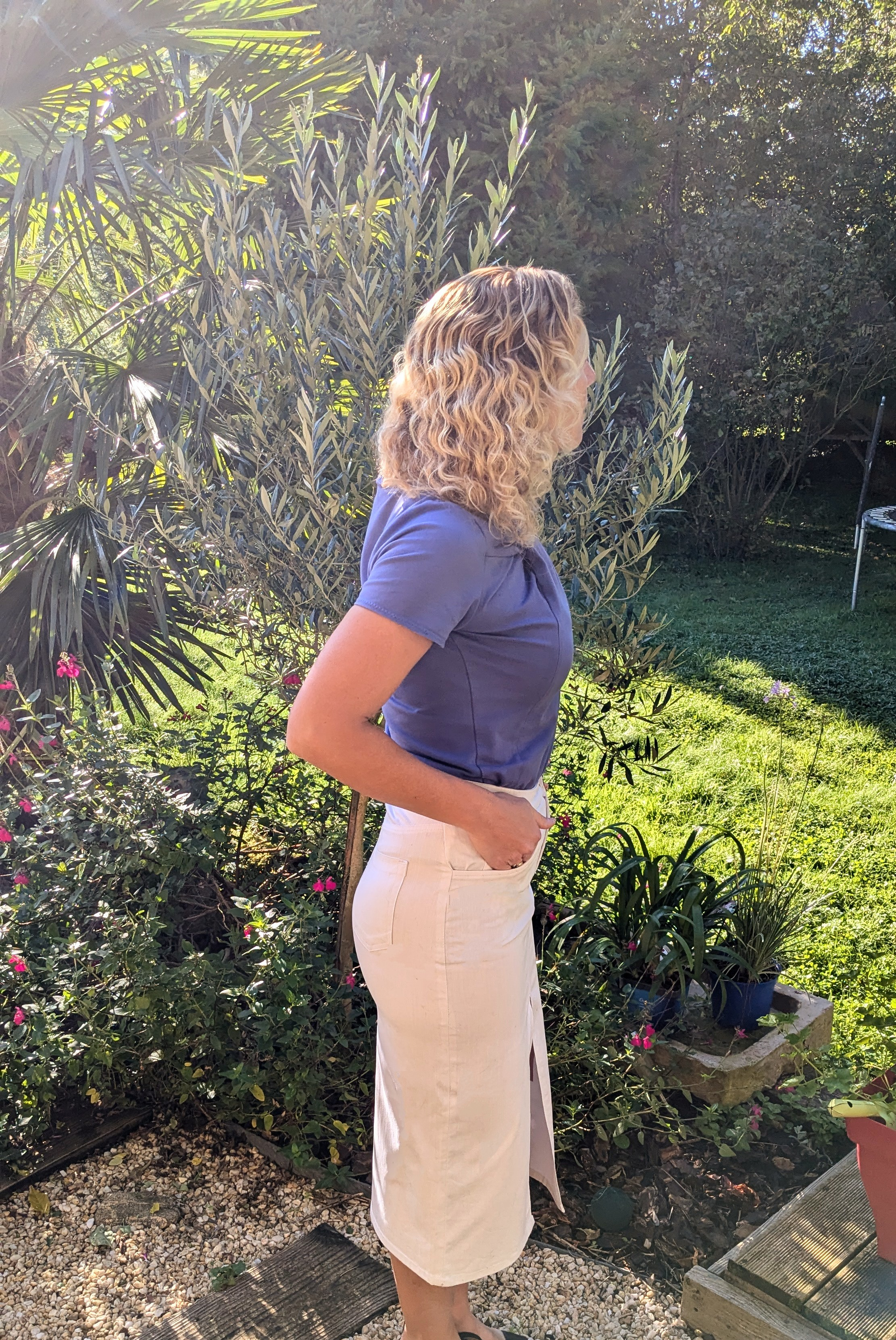 En bas , je porte mon coup de coeur de l’été , le patron que j’étais prête à patronner moi-même , cherchant désespérément une jupe en jean midi depuis des mois . Bella loves patterns l’a sorti , ce patron magique ,et je ne suis pas déçue du voyage ! Des instructions dignes de Closet core patterns ( = compliment ultime ) et des finitions géniales . J’ai cousu dans un dénim de chez Torretto Tessuti, une merveille non transparente , il faut le souligner ! Il me semble que j’ai coupé le 36 ici