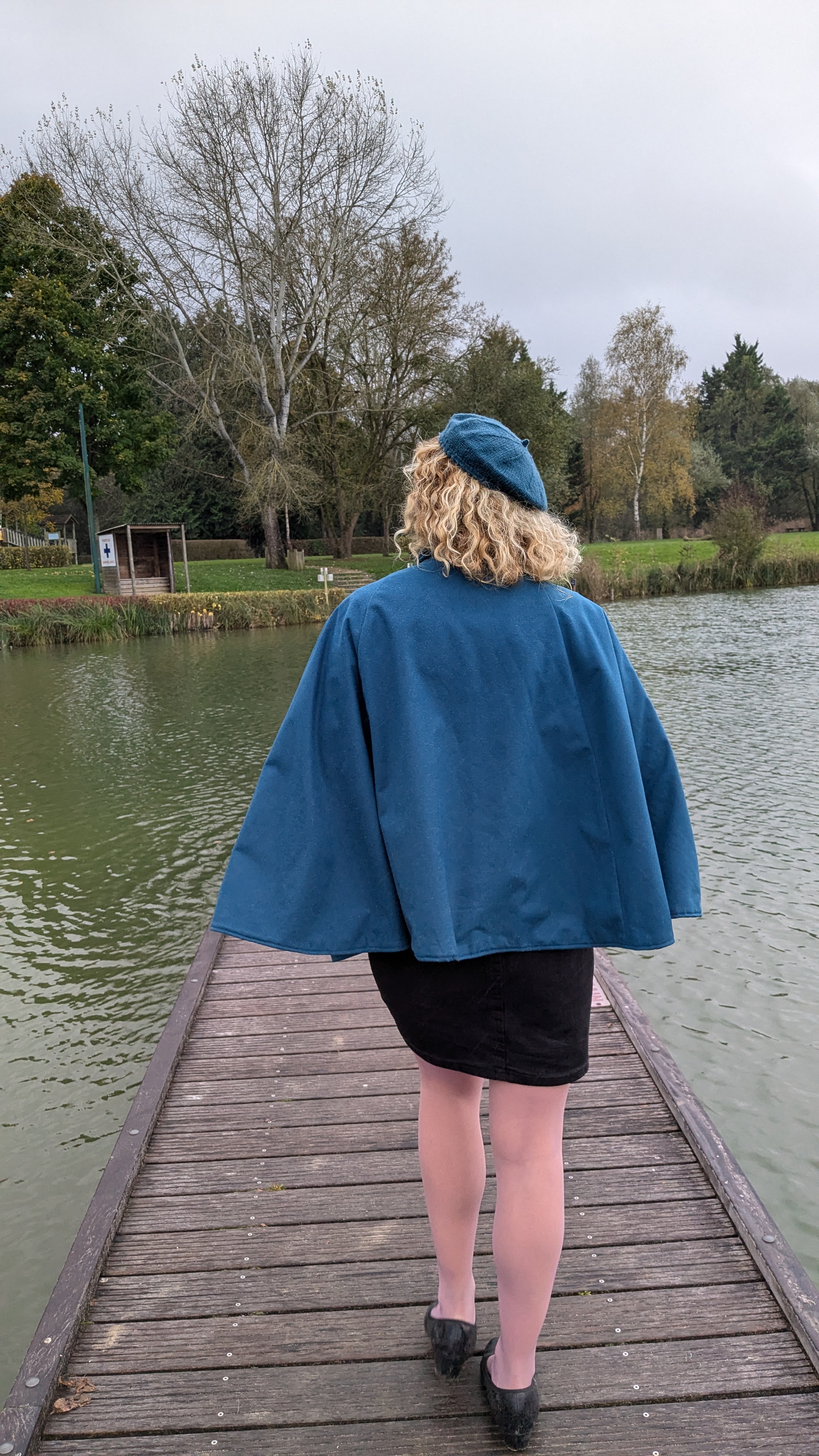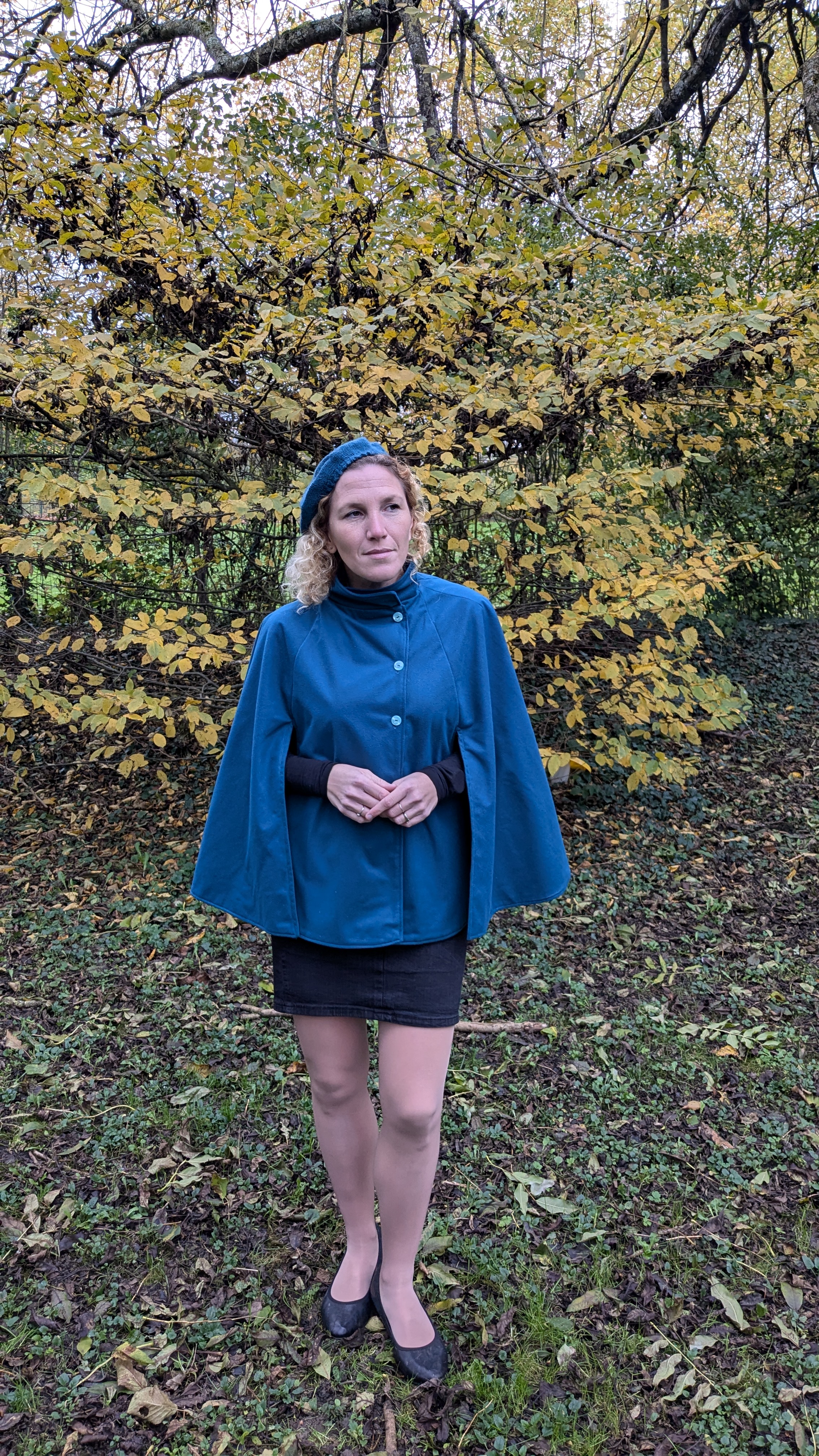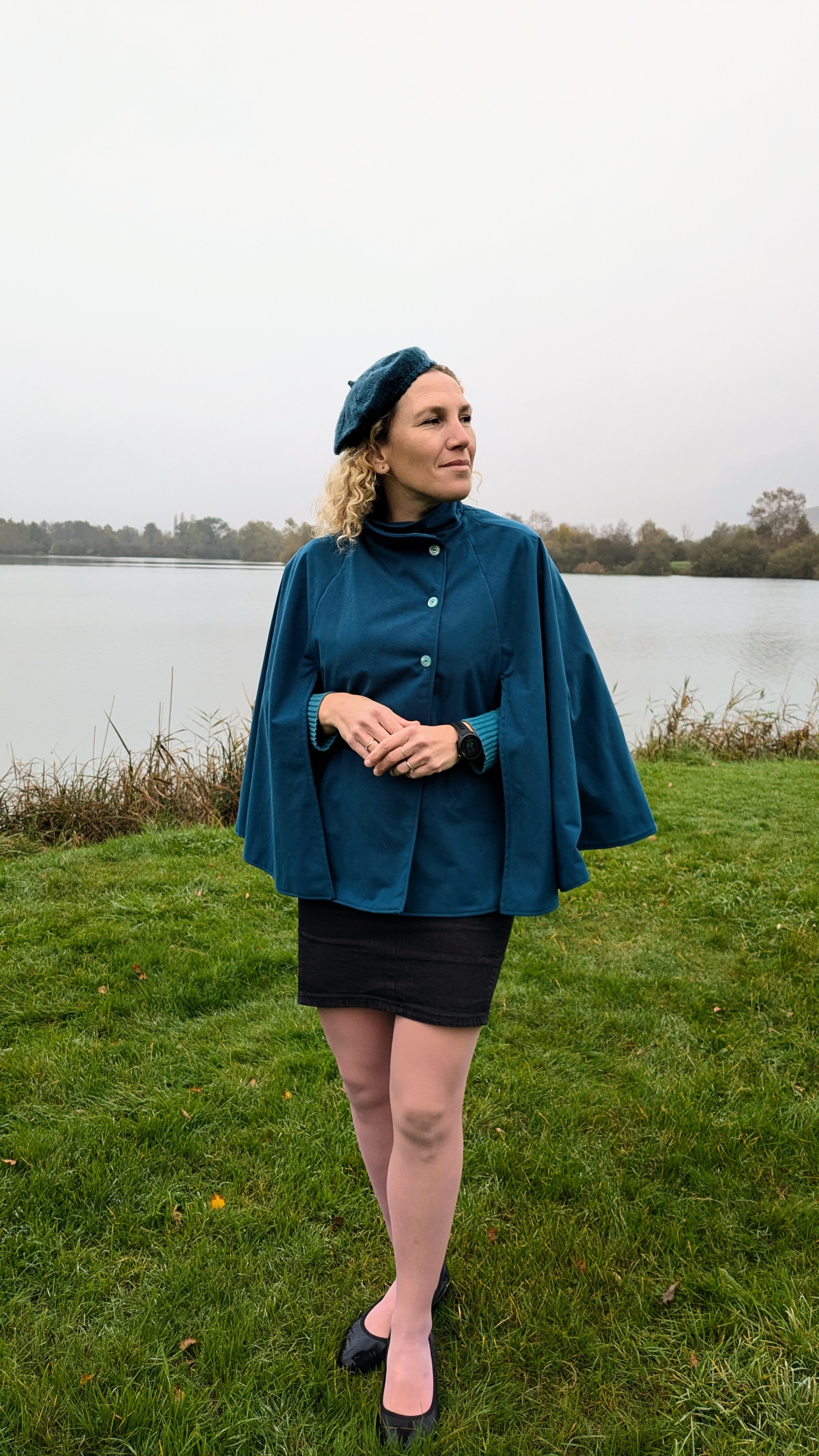 Alors la cape est parfaitement conçue , j’adore son petit col , j’ai effectué des surpiqûres partout pour maintenir la doublure , puis dernièrement en tricotant mon 4 ème béret Emilie de Lise Tailor ‘ avec de la laine mérinos Lise Tailor également ) , je me suis souvenue que j’avais cousu la cape exactement dans cette couleur et que l’association des deux me plairait beaucoup . J’ai sorti ma cape que je portais de temps en temps en fermant avec une broche et finalement décidé de coudre des boutonnières . Cela m’a pris 10 minutes à peine et me permet de la porter encore plus facilement . Mais surtout je suis si contente qu’elle soit complètement terminée et juste pour moi !