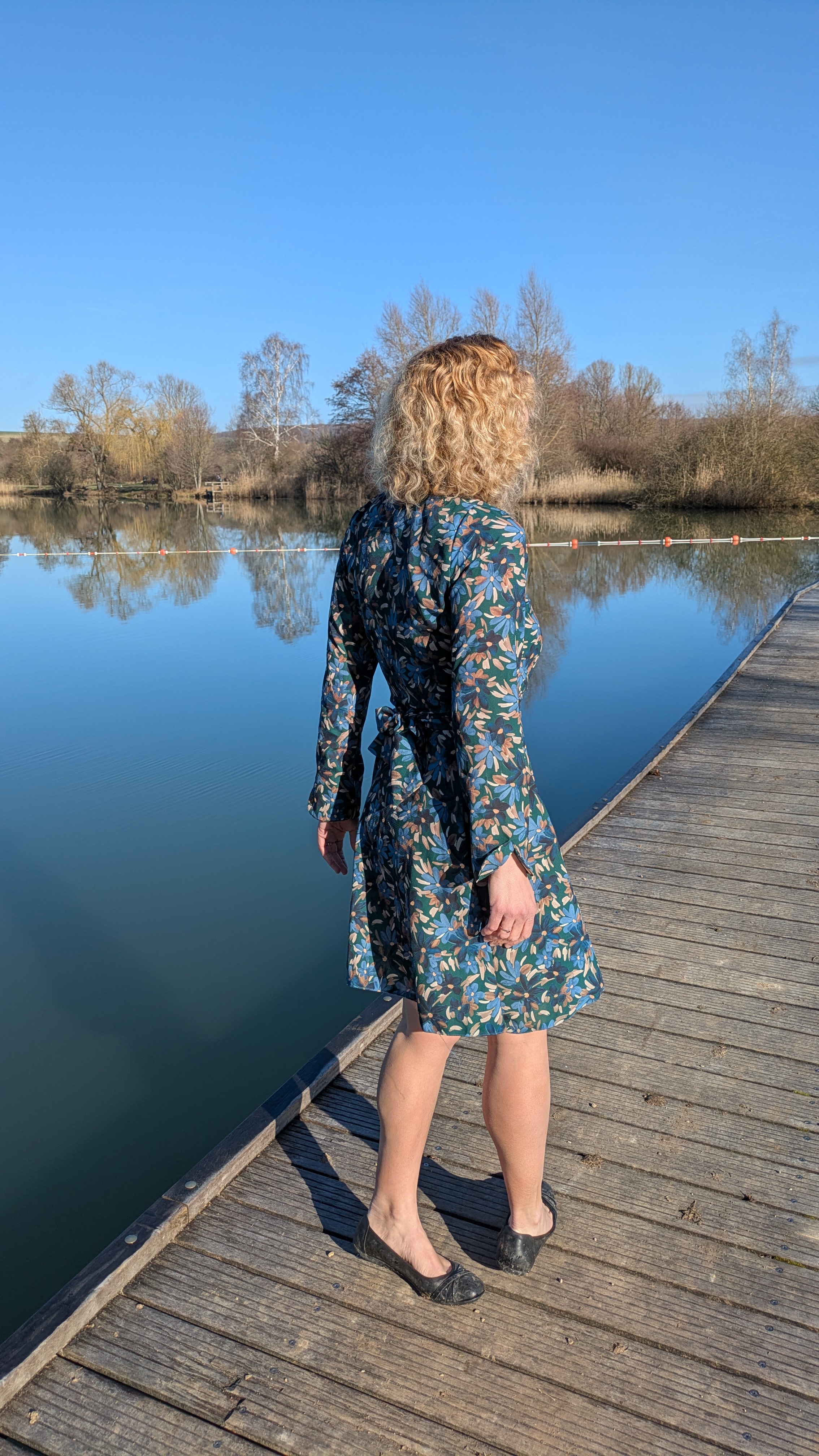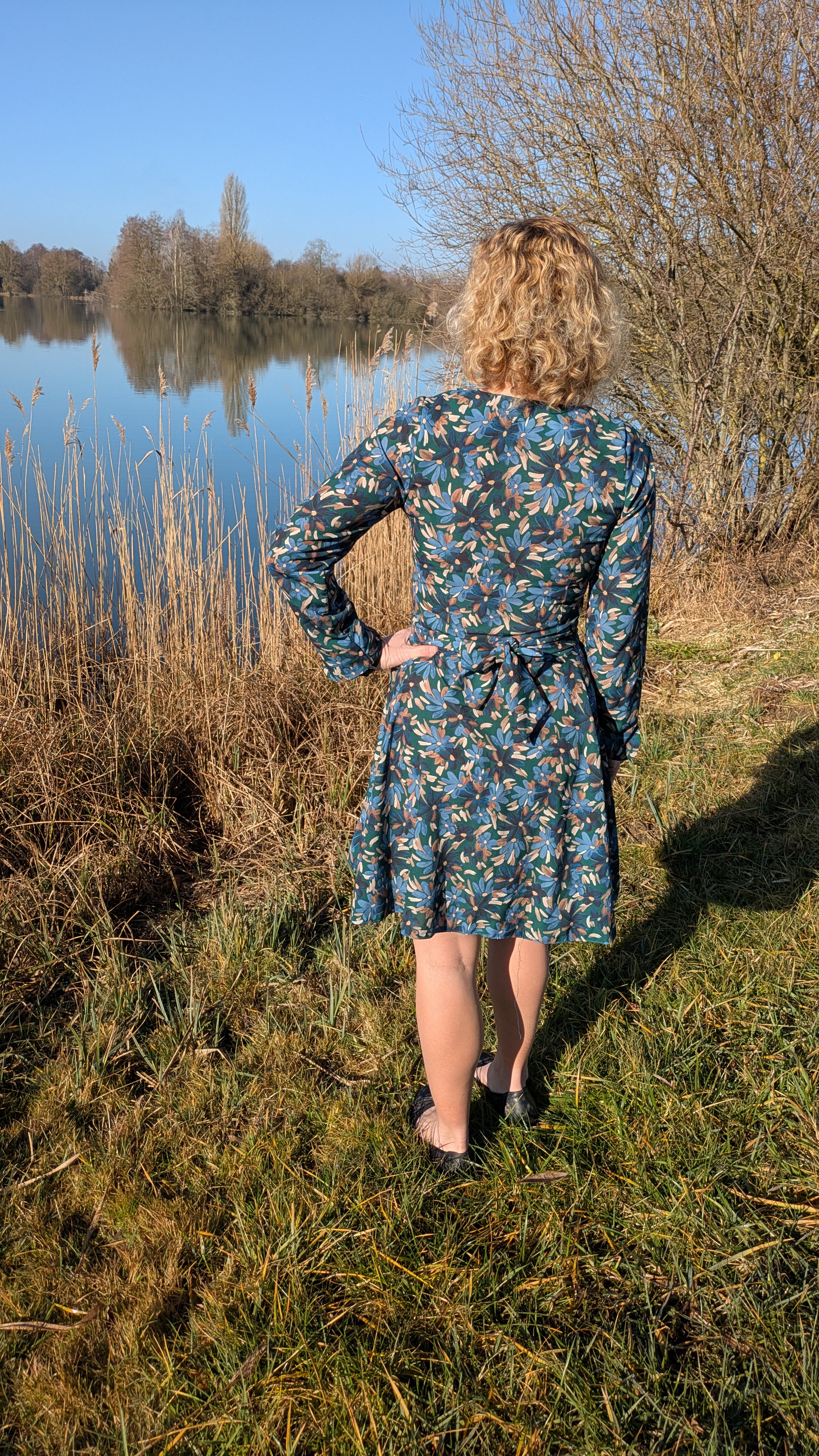 Il m’a fallu 2 mètres de tissu et j’ai opté pour ce crêpe de chez Atelier 27 France acheté dès sa sortie et gardé précieusement depuis . J’ai utilisé des aiguilles microtex et thermocollé le décolleté sur le tissu extérieur et la doublure . J’ai coupé le 34 , le modèle est moins ajusté qu’il n’y parait ( la ceinture cousue dans les chutes me permet de resserrer la taille si j’ai envie ) . Pour l’ourlet j’ai eu recours à la technique de l’ourlet mouchoir longue mais très gratifiante